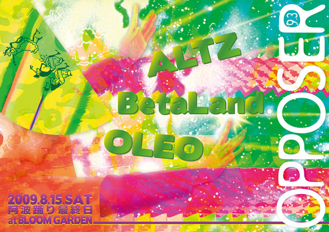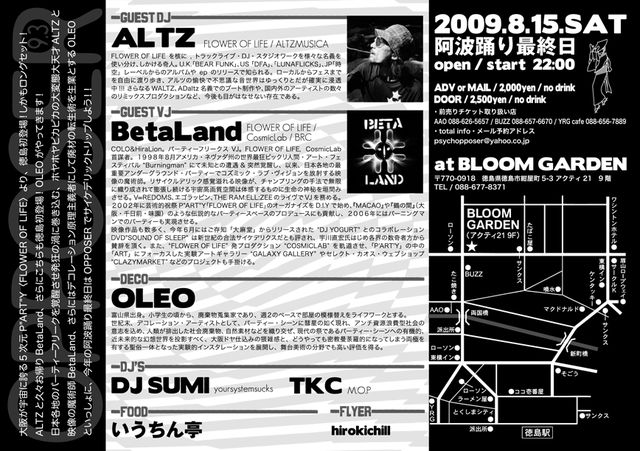 管理人様、告知失礼致します。 不適切な場合は、削除よろしくお願いします。 OPPOSER 9.3 2009.8.15.(sat)阿波踊り最終日 @ BLOOM GARDEN 〒770-0918 徳島県徳島市紺屋町5-3 アクティ21 9階 088-677-8371 -guest dj- ALTZ(FLOWER OF LIFE / ALTZMUSICA) --- SPECIAL LONG SET!!!! --- http://www.altzmusica.com/ -guest vj- BetaLand(FLOWER OF LIFE / CosmicLab / BRC) http://www.cwo.zaq.ne.jp/betaland/INDEX.html -deco- OLEO http://www.galaxygallery.info/history/2009/oleo.html -dj's