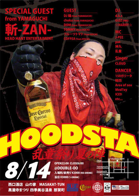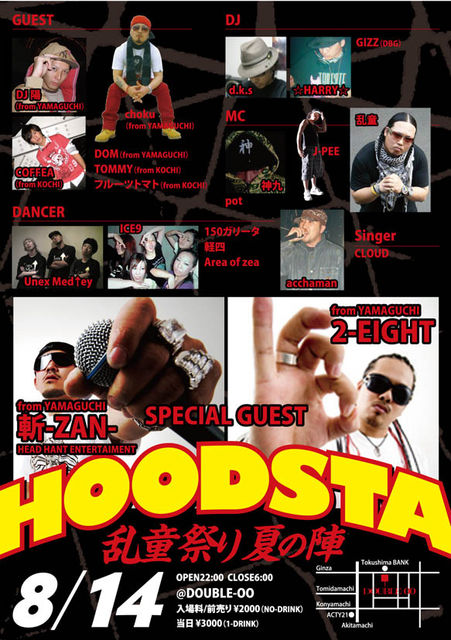 〜乱童 presents〜 『HOODSTA〜乱童祭り夏の陣〜 』 @DOUBLE-OO 徳島市富田浜1丁目アクティ徳島5F OPEN 22:00 CLOSE 5:30 前売り---\ 2,000 (NO DRINK) 当日---\ 3,000 (1D) ■SPECIAL GUEST■ 斬-ZAN-(from YAMAGUCHI) 2-EIGHT(from HIROSHIMA) ■GUEST from YAMAGUCHI■ DJ 陽 / Choku / DOM ■GUEST from KOCHI■ フルーツトマト / COFFEA etc... ■DJ■ d.k.s / GIZZ(D.B.G) / ☆HARRY☆ ■MC■ ACCHAMAN / J-PEE / pot / 神九 / 乱童 etc... ■SINGER■ CLOUD ■DANCE■