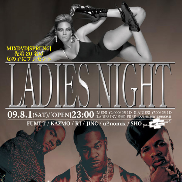 PLUS PARK 8月最初のイベントは 女の子に優しいイベントとして人気の「LADIES NIGHT」 女の子はなんとCHARGE \500!! さらに今回は先着20名のLADIESにu2nomixの 最新MIX DVD「SPRUNG」をプレゼントしちゃいます☆ ------------------------------------------------------------------------------------------------ ■日時:2009.8/1(SAT) 23:00〜 ■料金:MEN \2,000/別1D LADIES \500/別1D LADIES INV 持参 \FREE/別1D ■DJ:FUMI-T / KAZMO / RJ / JING / u2nomix / SHO PLUS PARK 名古屋市中区栄3-8