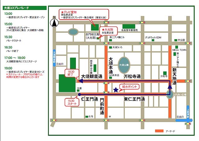 2009年夏・大須コスプレパレードへ 参加ご予定の方、よかったら、参加表明をお願いいたします。 なお、このイベントトピは、参加者の自主的な情報交換と 交流を目的としています。 −この情報は、公式より引用しています。− 最新情報は、公式ページを常にチェックを入れてください。 ☆は、2009年からの変更事項 【公式HP】 http://www.tv-aichi.co.jp/wcs/2009/index.php 【同・パレード情報】 http://www.tv-aichi.co.jp/wcs/summary/parade.html 【パレード予定コース】 http://www.tv-aichi.co.jp/wcs/2009/event/