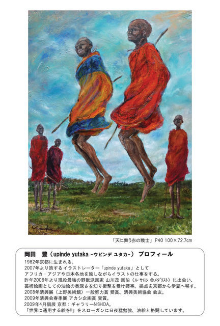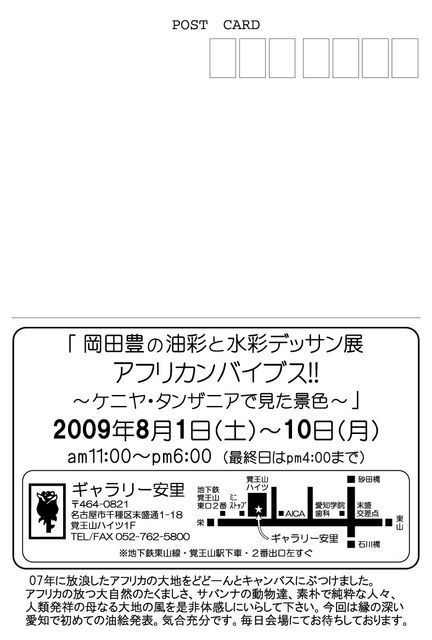 今回は油絵展とイラスト展を2会場で同時開催でーす。 このトピックは油絵展案内〜。 8月1日(土)〜10日(月)覚王山のギャラリー安里さんでやらせてもらいます。 僕は会期中、基本的にこっちにいてまーす。 こちらも11:00〜18:00の展示です。 今回は07年に放浪したアフリカの大地をキャンバスにぶつけた 「アフリカンバイブス!!〜ケニヤ・タンザニアで見た景色〜」 でやりまーす。 大作もただ今制作中〜。 みなさん是非見に来てくださーい。 案内状希望の方は知らない方でも全然OKなのでメール下さーい。