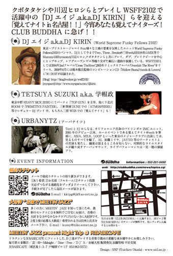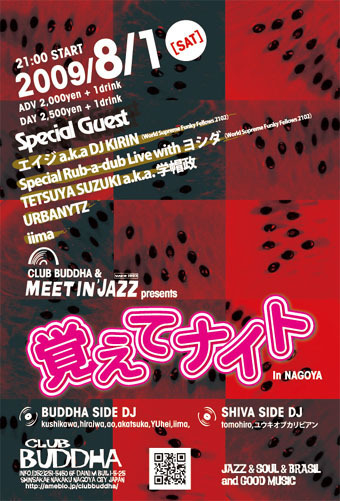 管理人様、コミュニティの皆様、告知失礼致します。 不適切な場合ご削除宜しくお願い致します。 クボタタケシや川辺ヒロシらとプレイし、 WSFF2102 で活躍中の「エイジa.k.a DJ KIRIN」らを迎える 「覚えてナイトin名古屋!!」 今宵あなたも覚えてナイターズ!CLUB BUDDHAに急げ!! ■スペシャルゲスト: ・エイジ a.k.a DJ KIRIN(World Supreme Funky Fellows 2102) ・Special Rub-a-dub Live with ヨシダ(World Supreme Funky Fellows 2102) ・TETSUYA SUZUKI a.k.a. 学帽政 ・URBANYTZ ・iima □日時:2009年8月1