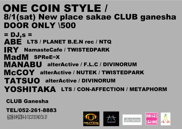 8/1(sat) ONE COIN STYLE / DOOR ONLY \500 New place sakae CLUB Ganesha (クラブ・ガネシャ) 名古屋市中区栄4-8-18コスモONOビル 3F TEL/052-261-8883 DJ,s ABE ( LTS / PLANET B.E.N rec / NTQ ) IRY (NamasteCafe / TWISTEDPARK ) MadM ( SPReE∞X ) MANABU ( alterActive / F.L.C / DIVINORUM ) McCOY ( alterActive / NUTEK RECORDS / TWISTEDPARK ) TATSUO ( alterActive / DIVINORUM ) YOSHITAKA ( LTS / CON-AFFECTION / METAPHORM