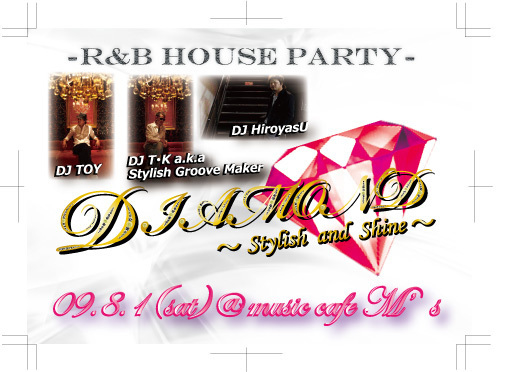 管理人様、イベントの告知失礼いたします。 今週土曜日、名古屋ではもうお馴染みのNo.1ウタモノオシャレPARTY DIAMOND〜Stylish & Shine〜 がmusic cafe M'sに移って、初の開催となります 抜群にオシャレな店内で、いい音聴いて、美味い酒飲んで、最高の一夜になる事間違いなしのPARTYです DIAMONDとは・・・ 名古屋・三河から集結したGood DJ'sが、US・UKのウタモノはもちろん、最近話題の和製R&B・HOUSEまで、新旧問わず間違いない選曲で酔わせちゃうウタモノONLYで楽しめるオシャレPARTY DI