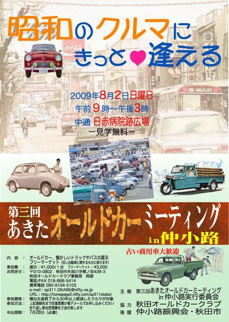 『第3回 あきたオールドカーミーティング in 仲小路 』開催のお知らせ 1、日時 2009年8月2日 日曜日 午前9時〜午後3時 2、場所 秋田県秋田市中通一丁目18-1 日赤病院跡広場 (秋田中央道 秋田駅前・中央街区出口) 3、主催 秋田オールドカークラブ 4、内容 ?オールドカー、懐かしいトラックやバスの展示 ?フリーマーケット(但し自動車に関するものに限ります) 5、参加費 展示:一台¥1,000 フリーマーケット:\3,000 6、問い合わせ先 〒010−0802 秋田市外旭川字梶ノ目439−3 秋田オール