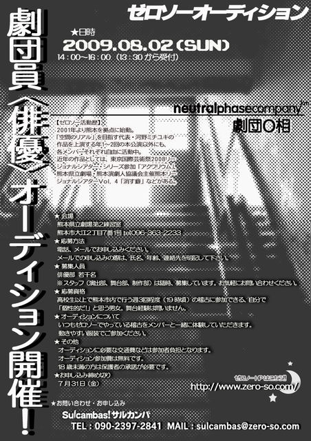 **ゼロソーオーディション2009** 来年でゼロソーは10歳!! 10周年記念ツアーに向けてのオーディションを開催します! * 日時 2009年8月2日(日)14:00〜16:00 (13:30から受付) * 会場 熊本県立劇場 第2練習室 熊本市大江2丁目7番1号 tel:096-363-2233 * 応募方法 電話、メールでお申し込みください。 メールでの申し込みの際は、氏名、年齢、連絡先を明記して下さい。 * 募集人員 若干名 俳優、劇作、演出、舞台美術、照明、音響、舞台制作 など演劇に関わる各セクションで募集します! * 応募資格 高校生以上