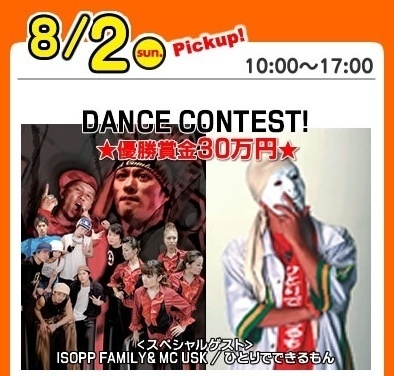 シーサイドフェスタ2009ダンスコンテスト 8月2日(日) 佐世保駅港口広場メインステージ 観覧無料 11:00〜Jr.の部 13:00〜ゲストショー『ひとりでできるもん』 13:25〜一般の部 15:30〜ゲストショー『ISOPP family+MC USK』 今年のシーフェスダンスコンテストには テレビや雑誌でおなじみ!ダンスを知らない人でも知ってる人が多いんではないでしょうか? DANCE業界では知らない人はいないKING OF DANCE MC『MC USK』 謎の覆面ダンサー『ひとりでできるもん』 HIP HOP男ISOPP率いる『Isopp FAMILY』 の登場です ISO