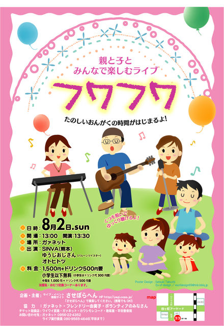 管理人様、失礼いたします。告知をさせて下さい。 親と子とみんなで楽しむライブ 『フワフワ』 日時:8月2日(日) 開場:13:00 開演:13:30 場所:ガァネット 長崎県佐世保市島ノ瀬町9−6 四ヶ町マクドナルド前 TEL:0956-22-4352 出演: SINVA(熊本) / ゆうじおじさん(バルーンツイスター) / オトヒトツ 料金:大人1500円+ドリンク500円 小学生以下無料 ※ただし小学生は300円ドリンク代要 中高生1000円+ドリンク500円 チケット取扱店:ワイワイ貿易・ガァネット・カ