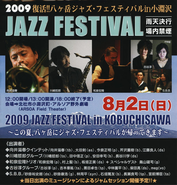 八ヶ岳ジャズフェスティバルが十数年の時を経て帰って来ます。 名プレイヤー、名バンドのサウンドを高原で楽しみましょう。 出演者による豪華なジャムセッションも予定されています。 出演: ◆向井滋春クインテット 向井滋春(tb),太田剣(as),今泉正明(p),芦澤薫樹(b),江藤良人(ds) ◆川嶋哲郎グループ 川島哲朗(ts),田中信正(p),安田幸司(b),長谷川学(ds) ◆ 和泉宏隆トリオ 和泉宏隆(p),村上聖(b),板垣正美(ds)+スペシャルゲスト 鳥山雄司(gt) ◆ 古谷淳グループ 古谷淳(p),吉本章紘(p),黒田卓也(tp),中林薫平(b),柴田亮(ds),