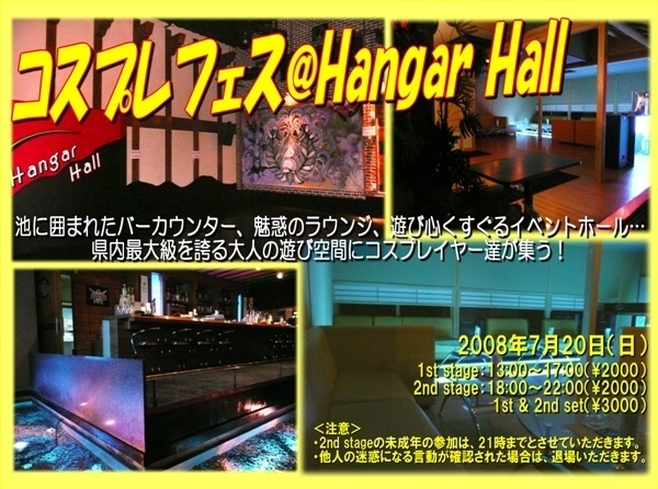8/2(日)山梨県の田富流通銀座にあるイベントホール・バー、 『Hangar Hall(ハンガーホール)』にてイベントを開催いたします。 宜しけれ ばご参加下さい。 このイベントは山梨県にあるHangar Hallを1日お借りして、ロケやダンパ等を楽 しんで戴けるイベントです。 前回までコスフェス(仮)という形でイベント運営をさせていただいておりまし たが 1周年を迎えるにあたり「Palette」になりました。 ホールのなかは金魚の泳ぐ小川があったり お酒も戴けるBARカウンター等がございます。 BARカウンターではジュースや食べ物が