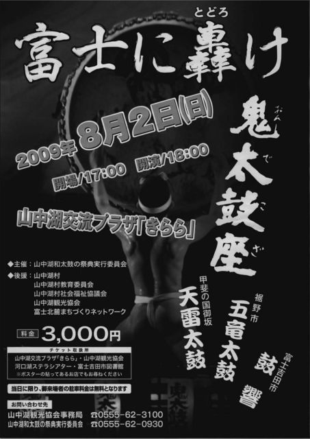 8月2日、山中湖交流プラザ「きらら」にプロの和太鼓集団「鬼太鼓座(オンデコザ)」がやって来ます。 鍛え上げられた肉体を持つプロの打人達が、山中湖の夏の夜空に魂を震わす太鼓の音を打ち響かせます。 地元からも3つの和太鼓チームが参加します。 和太鼓が好きと言う方、プロの演奏を見てみたいと言う方、地元太鼓チームに知り合いがいるから冷やかしに行ってやろうかなと言う方、どなたでもOKです。 是非皆さんお誘い合わせの上ご来場下さい。 プロの太鼓打ち達!! 鬼太鼓座「富士に轟け」 http://news.ondekoza.com/ 地元太鼓チー