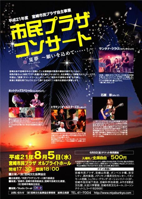 平成21年度 宮崎市民プラザ自主事業 「市民プラザコンサート」 開催日時 平成21年8月5日(水)開場17時30分 開演18時 開催場所 宮崎市民プラザ オルブライトホール 入場料/全席自由 500円 出演者 ホットドッグスペシャル(エレキサウンド) ヒラケンオールスターズ?(Jポップ) サンタナクラブ(ラテンサウンド) 石原彩(ポップ) 主 催(財団法人)宮崎文化振興協会 企画運営 市民プラザコンサート実行委員会