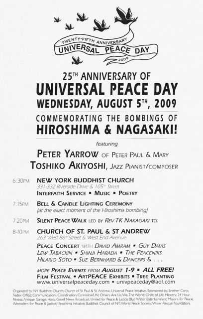 NY本願寺で日本時間の原爆記念日に追悼式典、そしてSt Paul & St Andrew教会への平和行進と平和祈念コンサートが行われます。宗教、国籍、民族、世代を超えて、一緒に平和を祈りませんか?