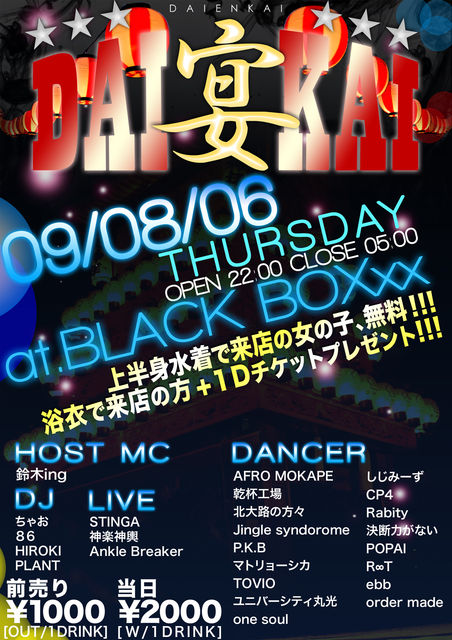 告知失礼します。 夏ですねぇ〜♪ 去年の初開催から1年DAI宴KAIの夏祭りがやってきました!!! 今年も暑い夜をさらに熱くするパーティーイベントを開催しちゃいます☆ HIP HOP・R&B・HOUSE・J-POP・etcといった幅広いジャンルのDJプレイにLIVEありDANCEありと様々なコンテンツで皆さんをお出迎え。 そして今回は夏祭り企画として、上半身水着で来店の女の子は無料(ドリンク代別途)それ以外にも浴衣で来店の方にはもれなく1ドリンクチケットをもう1枚プレゼント!!! その他店内でもサプライズをご用意☆夏と言えば・・・ねぇ(笑) テ