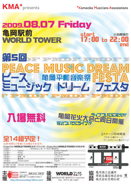 スミマセン! 告知させて下さい。 今年も真夏の祭典が、いよいよやってくる! 今回から『Peace Music Dream Festa』と改め! 気持ちも! 企画も! 新たに・・・ 2会場! 同時開催します。 と き/8月7日(金) 17:00スタート ところ/WORLD TOWER(亀岡駅前) ■Stage-WEST(PLANET前) ■Stage-EAST(東側駐車場) 主 催/KMA Kameoka Musicians Association 後 援/WORLDグループ 出 演/全14組 ●Stage-East toowy/mitsu/se-ba/砂布 均/風兄