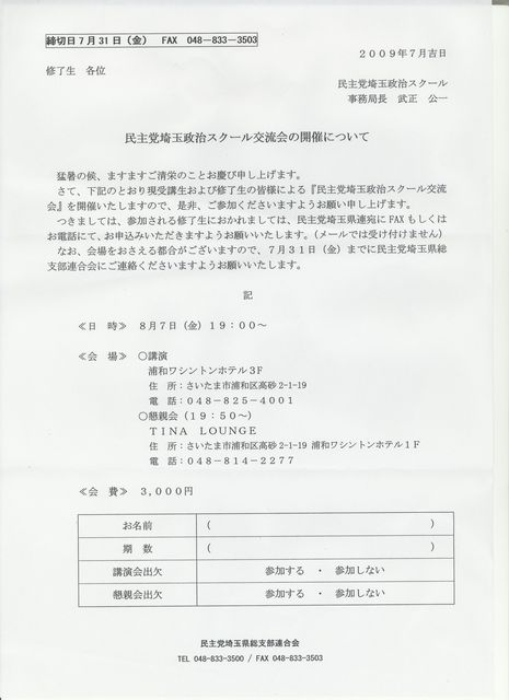 ●民主党埼玉政治スクール、現受講生と修了生の交流会 民主党埼玉県連に、7月31日までにFAX・電話で申し込みのこと(メール不可)