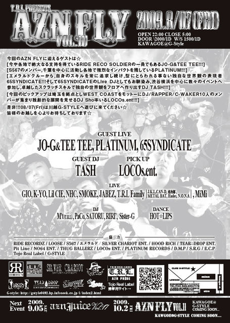 2009/08/07(FRI) T.R.L PRESENTS 「AZN FLY vol.10」 KAWAGOE@G-Style OPEN 22:00 CLOSE 5:00 DOOR \2000/1D W/S 1500/1D [GUEST LIVE] ・JO-G&TEE TEE ・PLATINUM ・65SYNDICATE [GUEST DJ] ・TASH [PICK UP] ・LOCOs.ent. [LIVE] ・GIO ・K-YO ・Lil CIE ・NHC ・SMOKE ・JABEZ ・T.R.L Family (J.K.L,CAN-D,勇次郎,METAL BAT,Hades,N.O.N.A) ・MiMi [DJ] ・M't(T.R.L) ・PaCo ・SATORU ・Sho ・RIRI’ ・Sister-G [DANCE] ・HOT☆LIPS 「協力」 RIDE RECORDZ LOOSE S567