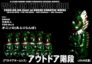 今週末一本目8月8日(土)は、遂に関西アンダーグラウンド界奇跡のコラボユニットがCHAOTIC NOISEに登場!!! 最早説明不要、関西地下音楽会のドン・JOJO広重(非常階段)がオシリペンペンズ、巨人ゆえにでかい、手の内嫁像らのメンバーからなる踊れるSCUM軍団・アウトドアホームレスとドッキング!! 何が起こるか予測不能!!混沌必至のライブを体感して下さ〜い!!! 続く二本目8月9日(日)は、毎年恒例PUNKの日!! 今年は神戸よりFAAFAAZ、香川よりN.H.Pを迎え行います〜!! 詳細はこちら↓ ● 08月08日(土) [ WALK ONTHE WILD SIDE ] PM 6:30 OPE