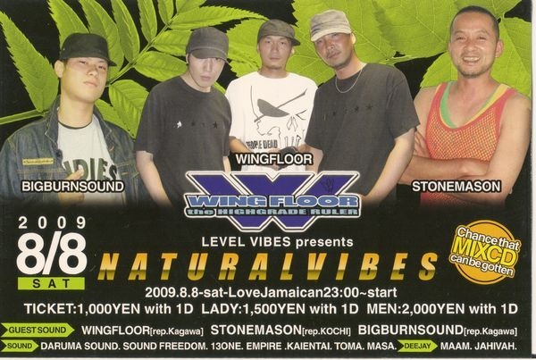 2009.8.8(sat) 『LEVEL VIBES』 =プレゼンツ= ”NATURAL VIBES” at LOVE JAMAICAN OPEN 22:00 入場料 前売りチケット:\1000 ≪1ドリンク付≫ ADM:\2000 ≪1ドリンク付≫ Lady:\1500 ≪1ドリンク付≫ LEVEL VIBES ORIGINAL CD をプレゼント(数量限定) それと!”先着20名にレベルバイブスのライターもプレゼント!!もらってない人はGETしなきゃね” -Music by- 【GUEST SOUND】 WING FLOOR From高松 STONE MASON From高知 BIGBURN SOUND From高松 【Sound】LEVEL VIBES CREW DARMA SOU