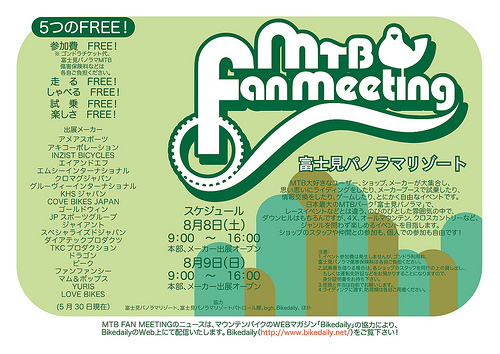 「今年も開催!、マウンテンバイクファンの集い『MTB FAN MEETING』。8月8日、9日の二日間、富士見パノラマで思い思いのスタイルで2日間楽しめる自由なイベントです。メーカーブースでニューモデルを試乗したり、ゲームをしたり、遊んで、語って楽しみましょう!」というイベントです。