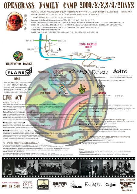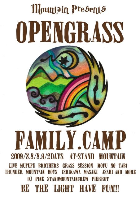 管理人様、告知失礼します。 富山県でOPEN GRASS FAMILY CAMPというイベントが開催されます。 今年から旧芦峅寺スキー場跡地 Stand Mountain初のFamily Campを開催する事となりました。 北陸を始めとして、関東関西の重鎮プレイヤー、若手注目株のアーティストが集結しました。 めったに体感できないフルアコースティックライブミュージックを山の中でお楽しみ下さい。 ▲TIME TABLE 8/8(Sat) 12:00〜開場 15:00〜SunSetShow 19:30〜LateShow 22:00〜AcousticFreeTime 8/9(Sun) 11:00