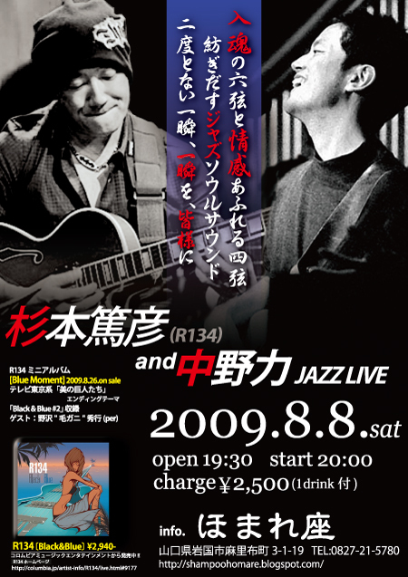 管理人様失礼致します ■2009/8/8(土) ほまれ座 杉本篤彦&中野力 JAZZ LIVE open 19:30 / start 20:00 \2,500(1ドリンク付) <杉本篤彦> ギタリスト、作・編曲家 http://web.mac.com/sugimoto.a/iWeb/R134/SugimotoAtsuhikoTop.html 高校、大学、実業団とアメリカンフットボールの選手として活動した後、23才より音楽活動に入る。 1995年から2007年まで16枚のリーダー・アルバムをリリース。 2008年、湘南をバックグラウンドとしたギターインストルメンタル・ユニット「R134」をドラマー大河原亮三と結成。 コ