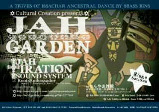 Roots&DUBなdanceです 平和的音楽と共に、自由な空間、natureパワーを感じていただけたら幸いです 水着持参で川に飛び込むもよし〜(小さなお子様でも大丈夫な川ですよ) 是非とも皆さんにも一度足を運んでいただきたい、そんなFreedomDanceです Cultural Creation Presents ☆JAH GARDEN☆ IN なんや友雑穀 (岐阜県加茂郡八百津町五宝平7126-2) TEL 0574-43-2797 http://www.dab.hi-ho.ne.jp/yuki2 8/8-9(SAT&SUN) 8日―OPEN19:00-CLOSE04:00 9日―OPEN12:00-CLOSE19:00 2days-adv-2000yen/1d 2days-door-2500y