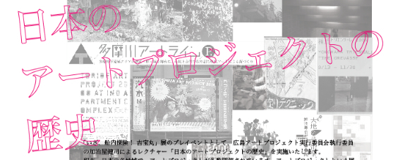 「いざ、船内探険! 吉宝丸」展のプレイベントとして、広島アートプロジェクト実行委員会執行委員の加治屋健司によるレクチャー「日本のアートプロジェクトの歴史」を実施いたします。 現在、日本の各地域で、アートプロジェクトが多数開催されています。アートプロジェクトという展示の形式を歴史的に振り返りながら、90年代以降、日本でアートプロジェクトが盛んになった経緯についてお話しします。本レクチャーへの皆様のご参加をお待ちしております。 「日本のアートプロジェクトの歴史」 講師:加治屋健司(広島市立大学准教授) 日時:8月