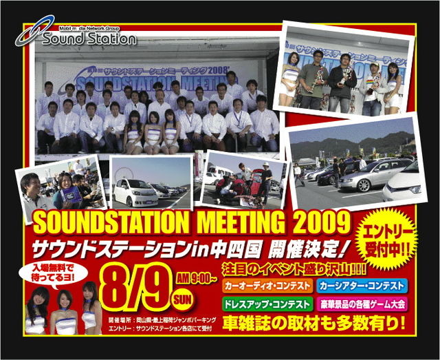 ************************************************************************ 開催日時:8月9日(日) 開催場所:岡山最上稲荷 ジャンボパーキング 参加条件:サウンドステーショングループにて取付車両 参加費用:見学は無料 エントリーは別途有料 詳 細 :カーオーディオコンテスト カーシアターコンテスト ドレスアップコンテスト イベント趣旨:お客様感謝デー☆ その他: 中止条件:雨天決行 問い合わせ先: お近くのサウンドステーション各店舗にて ********************************