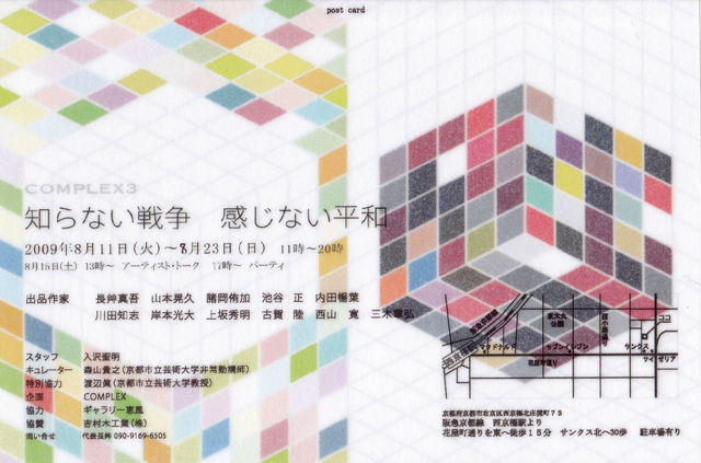 COMPLEX 3 「知らない戦争 感じない平和」 2009年8月11日(火)〜8月23日(日) 11時〜20時 8月15日(土) 13時〜 アーティスト・トーク 17時〜パーティ 出品作家 長艸真吾 山本晃久 諸岡侑加 池谷 正 内田暢葉 川田知志 岸本光大 上坂秀明 古賀 睦 西山 寛 三木章弘 場所 京都府京都市右京区西京極北庄境町73 阪急京都線 西京極駅より 花屋町通りを東へ徒歩15分 サンクス北へ30歩 駐車場あり お伝えしていた展覧会の詳細です。場所が分かりにくいので来て頂ける方は僕までご連絡ください。 b