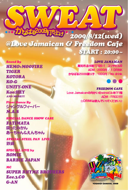 明日から ついに始まりますね 2009年高知よさこい祭り!!!!!!! よさこいチーム『かなばる』ぜひ お見逃しなく♬ すこし気が早いですが、 打ち上げイベントの詳細です☆ 踊り子だけではなく、どなたでも参加できるclub イベントなので ぜひ、最後までおつきあいください〜!!!! 今回は2カ所で開催なのでハシゴ♬返杯です! FATIMATA ソロあります 時間は早めで20時スタート☆ 目玉のSHOW TIMEも21時くらいにはスタート予定です/// 以下、詳細です! 2009/8/12(wed)@Love Jam