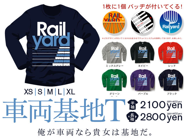 車両基地T【シャT】 受付終了です、たくさんのご注文ありがとうございました。 もう買えません、すみません、ごめんなさい。 ---以下リリース時の告知です--- 3/27発売予定の書籍「車両基地」著者 http://www.mediafactory.co.jp/c000051/archives/021/008/21870.html 萩原雅紀さんとマニアパのコラボアイテムです。 item*2 長袖&半袖(1枚に1個バッジ付) Color*6 ミックスグレー・ネイビー・レッド・ グリーン・パープル・ブラック Size*5 XS|S|M|L|XL| 完全受注生産となります。 振込等は後で構いま