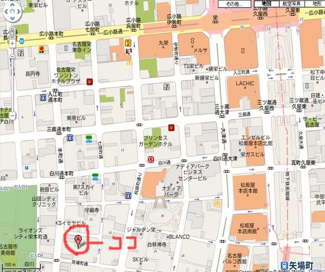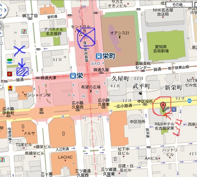 またまたやってまいりました!恒例のお盆帰省の時期です♪ 名古屋オフの日程&詳細決まりましたのでご確認下さい。 ----------------------------------- 日 程:8/15(土) 場 所:栄 集 合:現地直接(昼12:45〜12:55迄:夜18:55迄) 地 図:左:ビックエコー(赤い○の方。真ん中の青い×はTV塔。左のバツは錦店) 右:風来坊若宮店(赤い○が若宮店。カラオケ屋は地図右上端) ----------------------------------------------- ■昼カラ:ビックエコー広小路店(13:00〜18:30) 〒460-0008 名古屋市中区栄4-2-5