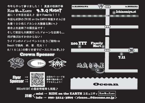 ※要パケ放題 今年もやって参りました 真夏の恒例行事 RIDE on the EARTH present's 『BBQ☆NIGHT』 遂に12年目を迎え益々PowerUp 今回も好評の『RIDE on the EARTH特製タオル』を 先着100名にドカンと大盤振る舞いッ (タオル詳細は決まり次第upします) 都合上今