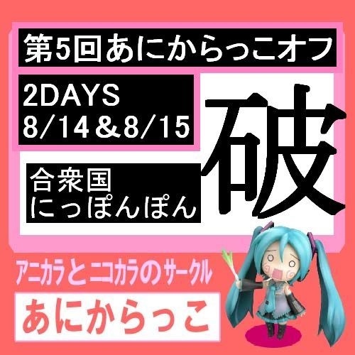 <8/15の2日目のオフは定員に達しましたので募集終了いたします> あにからっこ夏休みverって雰囲気でオフします!! 今回はまた新しい挑戦しますw なんと2日間連続コスカラします(゚∀゚) なるべくたくさんの人に参加してもらいたいと思いこの日程になりました。 8/14・8/15 第5回あにからっこオフ会〜2日間連続オフ〜 【8/15】2日日 8/15(土曜)13時15分〜19時(コス参加の場合11:45〜入室可能です) 場所:新宿カラ鉄 料金:¥1500(ソフトドリンク飲み放題付) 部屋:パーティールーム1室 18人締め切り(予定)