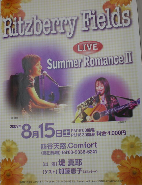 おかげ様で 6回目のワンマンライブです♪ 「Ritzberry Fields LIVE: Summer Romance?」 日時:8月15日(土) 開場/18時 開演/18時半 場所:四谷天窓Comfort(高田馬場) http://www.otonami.com/comfort/ 料金:前売り4000円(ドリンク別・お土産付) 当日 4000円( 〃 ・お土産無) ☆ゲストは加藤恵子(エレナー)です ☆今回も秘蔵映像を上映致します ☆新しいグッズも完成しましたので 当日販売致します ☆今回は混雑が予想されますので
