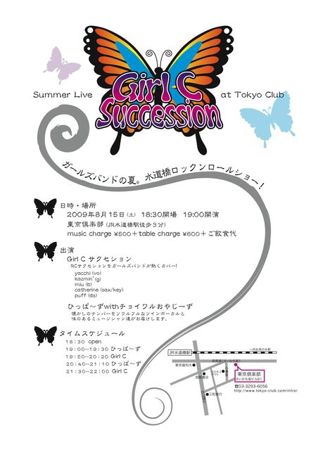 ◆ガールズバンドの夏。水道橋ロックンロールショー !◆ 日時・場所 2009年8月15日 (土)18:30開場 19:00開演 東京倶楽部 (JR水道橋駅徒歩3分) http://www.tokyo-club.com/intro/ music charge \500+table charge \600+ご飲食代 出演 ★Girl C サクセション ★ひっぱ〜ずwithチョイワルおやじーず time sckedule 18:30 open 19:00〜19:30ひっぱ〜ずwithチョイワル 19:50〜20:20Girl C サクセション 20:40〜21:10ひっぱ〜ずwithチョイワル 21:30〜22:00G
