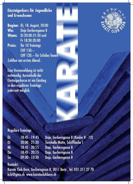 今年も空手のコースがあります。 8月18日(火)に空手クラブベルンで空手の講座が始まります。 http://www.kcb.ch を見てください。 あのコースは毎週火曜も金曜もです。