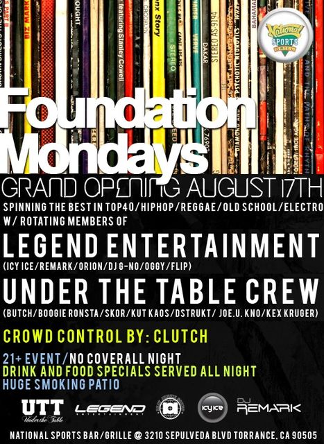 TorranceはSepulveda Blvd.沿いにあるSports Barで8月18日より毎週月曜日にLegend EntertainmenとUnder The Table Crewとでイベント"Foundation Mondays"を行います。 DJ陣はPower 106 FMからDJ ICY ICE、U92.7 (PALM SPRINGS)からDJ REMARK、そしてロサンゼルスのローカルDJクルーとしては数々のDJバトルなどでの入賞で有名なUnder The Turntable Crewによる毎週ローテーションとなっています。 僕、DJ OGGYも仲間とともにバッチリDJしていますので、ぜひともみなさん遊びにきてください!! ドレスコード、Entrance Feeも無しで終日フリーエントラ