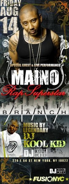 Maino Live performance @Club Brunch 新曲"Million Bucks"が最近のHip-Hop音楽チャートに上位にランクインされ、 今旬のアーティスト"Maino"が8月14日(金)のクラブイベントに 出演する事が決定!!当日は”Hi Hater”や”All The Above”等の有名なナンバーが 数曲が歌われる。同日、DJにはNYでも有名なKool Kidや日本人DJのAkiの参加も決まっている。 入場の際に"サウンドスケープ"というとゲストお扱いになり、女性は12時まで、男性は 11時まで入場料が無料となる。ドレスコード有り。21歳以上のID必須。 日時:8月14日(