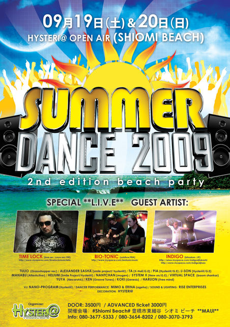 ■DATE<> 2009/09/19 (sat)~20(sun) SUMMER DANCE 2009.. 2 edition SHIOMI ビーチ SPECIAL *L.I.V.E*ARTIST GUEST: *TIME LOCK (bne records/ISR) http://www.myspace.com/timelockmusicfelix ・BIO-TONIC (solstice/FRA) http://www.myspace.com/biotonicmusic ・INDIGO (blissdom /JP) http://www.myspace.com/indigodjtakashi http://www.myspace.com/indigodjisao ■PLACE:::: (場所)   豊橋市東細谷 SHIOMI ビーチ MAUI ▼LINE-UP:::: ■SPECIAL STAR DJ GUEST:::: ・T
