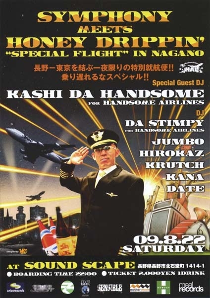 管理人様告知失礼します。 偶数月第4土曜日に長野SoundScapeで開催されているSOUL/FUNKなどのBlackMusicをメインとしたParty"Symphomny"ですが、今回は「長野−東京を結ぶ一夜限りの特別就航便!!乗り遅れるなスペシャル!!」と銘打ちまして、渋谷Harlem 3階 BX CAFE 毎月第3土曜のフライト、"HONEY DRIPPIN"を主宰する KASHI DA HANDSOME a.k.a 機長 (for HANDSOME AIRLINES) を迎え、「Symphony meets Honey Drippin'」という形でお送りします!!! HIPHOP/FUNK/SOULはもちろん世界のグッドミュージックをこよなく愛し、ジャンルという壁を軽々ま