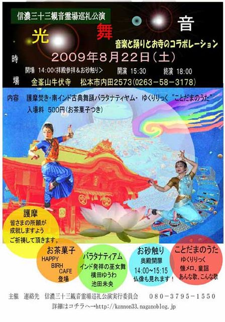 「信濃三十三観音霊場 巡礼公演」 http://kannon33.naganoblog.jp/c16222.html 今回で2度目となる巡礼公演。 第27番札所の金峯山牛伏寺さんで行なうことになりました☆ ☆信濃三十三観音霊場とは ? 観音巡礼とは、今から約1300年ほど前に、徳道上人によってはじめられたもので、その後、花山法皇によって再興されました。観音霊場(観音さまをおまつりしているお寺)を巡礼することで、観音さまとご縁を結び、また自分の中にある信仰心を確認していくことで、悩みや苦しみから救われようとするものです。またこの際に、御法印(ご朱印