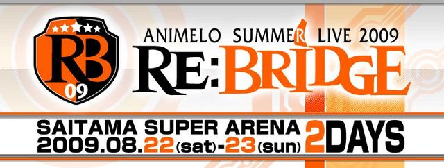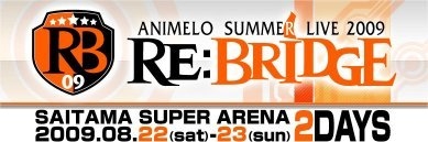 タイトル Animelo Summer Live 2009 -RE:BRIDGE- 日時 2009年8月22日(土)、8月23日(日) 各日 14:00開場、16:00開演 会場 さいたまスーパーアリーナ 出演 8月22日(土) 彩音、 ALI PROJECT、 石川智晶、 いとうかなこ、 ELISA、 栗林みな実、 JAM Project(影山ヒロノブ、遠藤正明、きただにひろし、奥井雅美、福山芳樹)、 茅原実里、 桃井はるこ 他(50音順) 8月23日(日) 奥井雅美、 サイキックラバー、 榊原ゆい、 savage genius、 Suara、 平野綾、 FictionJunction、 水樹奈々、 米倉千尋 、★田村ゆかり★ 他 http://a