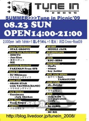 管理人様、8/23マサキオンザマイク出演イベントの 告知を失礼致します ★★8/23 Tune in Picnic★★ 2009/8/23(SUN) 14:00-21:00@川口Cross-Road39☆ 夏、皆で作る夏フェス!! http://blog.livedoor.jp/tunein_2008/ ■CHARGE 2000YEN (1drink+1流しそうめん+1花火付) 『Tune in』mixiコミュニティ http://mixi.jp/view_community.pl?id=2854320 【Tune in Picnic 動画CM解禁!!】>>> http://blog.livedoor.jp/tunein_2008/archives/51231806.html 生バンド&ダンサー参加型Freestyle Session「生