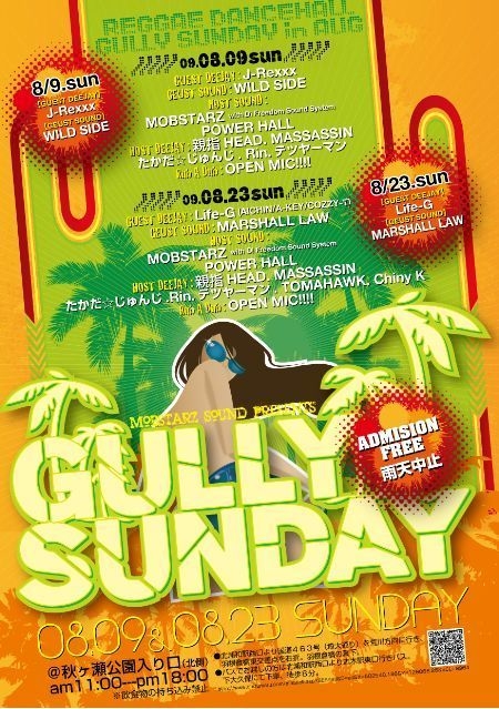 告知失礼します。 ジャパレゲ好きも集合です!! 【イベント開催日程】 2009 年 08 月 23 日 【エリア選択】 関東・甲信越 【イベントタイトル】 GULLY SUNDAY 【会場名・会場住所・会場TEL】 秋ヶ瀬公園 埼玉県さいたま市桜区下大久保 【出演者】 <GULLY SUNDAY> <雨天中止> ☆入場無料 =GUESTDEEJAY= ●Life-G =GUEST SOUND= ●MARSHALL LOW =HOST SOUND= ●MOBSTARZ SOUND with FREEDOM Sound System 1 ●POWER HALL =HOST DEEJAY= ●親指HEAD ●MASSASIN ●たかだ