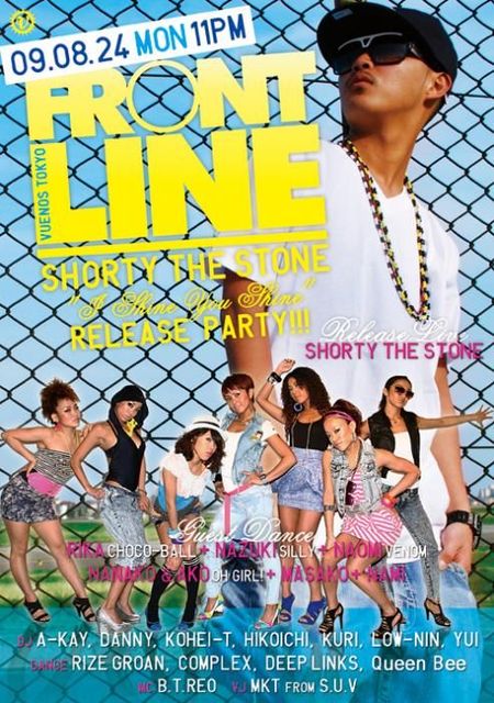 満員御礼『FRONT LINE』!!!!週の頭の月曜日にもかかわらず毎度の大盛況ありがとうございます!!今回はFrontlineレギュラーMC.Shorty The Stoneの1stアルバム”I Shine You Shine”リリースパーティー大開催!!さらにGuestDanceには普段は見られないスペシャルユニットによるパフォーマンスをご用意!!DJ陣はDJ A-KAYを筆頭に若手注目株 DJ DANNY. KOHEI-T他良質な音楽をご用意してお待ちしております。 今回もLive/Dance/DJ三大要素全開でぶっちぎります!!『FRONT LINE』。8月24日は是非ともVUENOS TOKYOへ!!