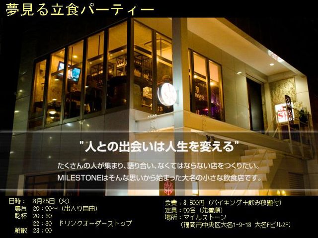 ★☆★☆★☆★☆★☆★☆★☆★☆★☆ 第3回 夢見る立食パーティー in 大名 8月25日(火) ★☆★☆★☆★☆★☆★☆★☆★☆★☆ 愚痴の出ない飲み会 新しい出会いのある飲み会 一人でも参加できる飲み会 学生と社会人が集まる飲み会 自分の夢を語れる飲み会 そんな飲み会を目指しています。 主催者:あにゃん ●○● 内 容 ●○● 【夢】キーワードに、とにかくワイワイしましょう! * 立食形式で、夢や想いを語り合ってください! * 若者主張!! 今回は主催のあにゃんが語