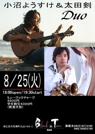 8月25日火曜日 19:30〜 小沼ようすけ&太田剣Duoライブ http://www.heartmusic.co.jp/YosukeOnuma/ http://kenota.net/ 若手人気No.1ギタリスト&サックスプレイヤー 二大スターのデュオライブツアー。 今や若手No.1ジャズ・ギタリストとの呼び声も高い 海とサーフィンをこよなく愛するジャズギタリスト小沼ようすけ ストレートなジャズにこだわることなく、 R&B、ファンク、ブラジル音楽等とジャズを融合させ 独自の世界を表現、現在の日本ジャズシーンで 最も輝いているサックス奏者、
