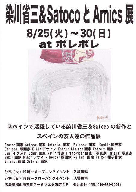 8月25日から30日まで 染川省三&SatocoとAmics 展 http://www.geocities.jp/somekawashozo/ ふたりが来日します、お楽しみに! 8/25(火)19時より 染川さとこ 作文朗読(西語・英語・カタラン語・日本語)&染川省三演奏 8/30(日)19時より 染川さとこ インドの旅のはなし 演奏:パンクメ、With You、染川省三